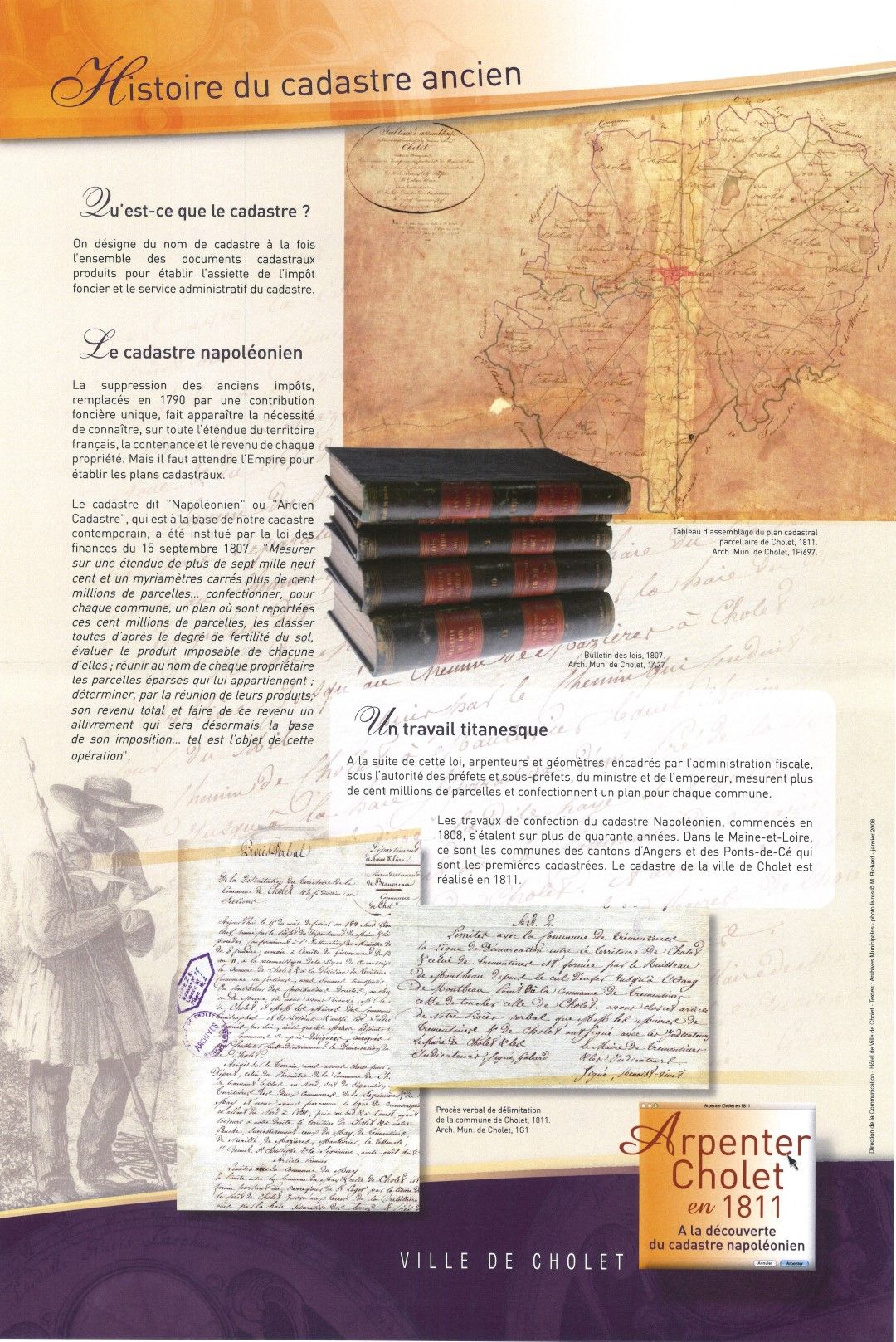 Les travaux de confection du Cadastre Napoléonien, commencés en 1808, s’étalent sur plus de quarante années. Dans le Maine-et-Loire, ce sont les communes des cantons d’Angers et des Ponts-de-Cé qui sont les premières cadastrées. Le cadastre de la ville de Cholet est réalisé en 1811.