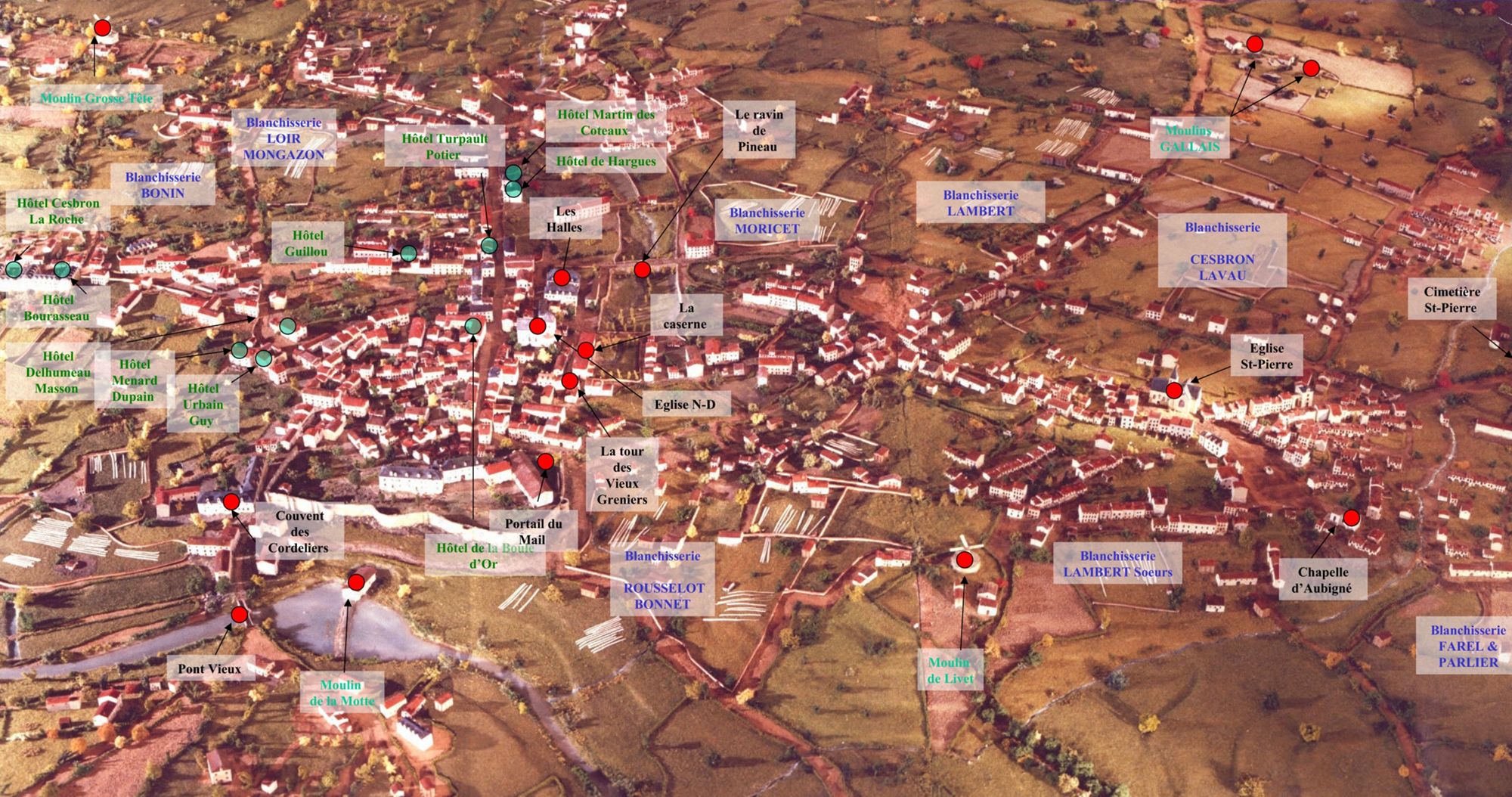 Commune d’environ 7 000 habitants, Cholet ressemble davantage à un gros bourg industrieux qu’à une ville. Les limites de la ville sont alors au Nord : les moulins Grosse-Tête et Chaillou - Au Sud : la Caillière et la ferme de la Haie - À l’Est : le cimetière Saint-Pierre - À l’Ouest : Saint-Melaine. Quelques 1000 maisons regroupées autour de l’église Notre-Dame et de l’église Saint-Pierre ont alors une allure paisible. Rien ne manque : le ruisseau de Pineau, le château dominant la Moine, les blanchisseries et moulins…