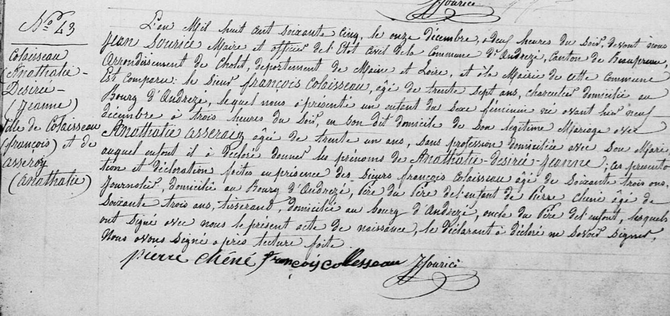 Acte de naissance, 1865 - Archives départementales de Maine-et-Loire, 6E6/13