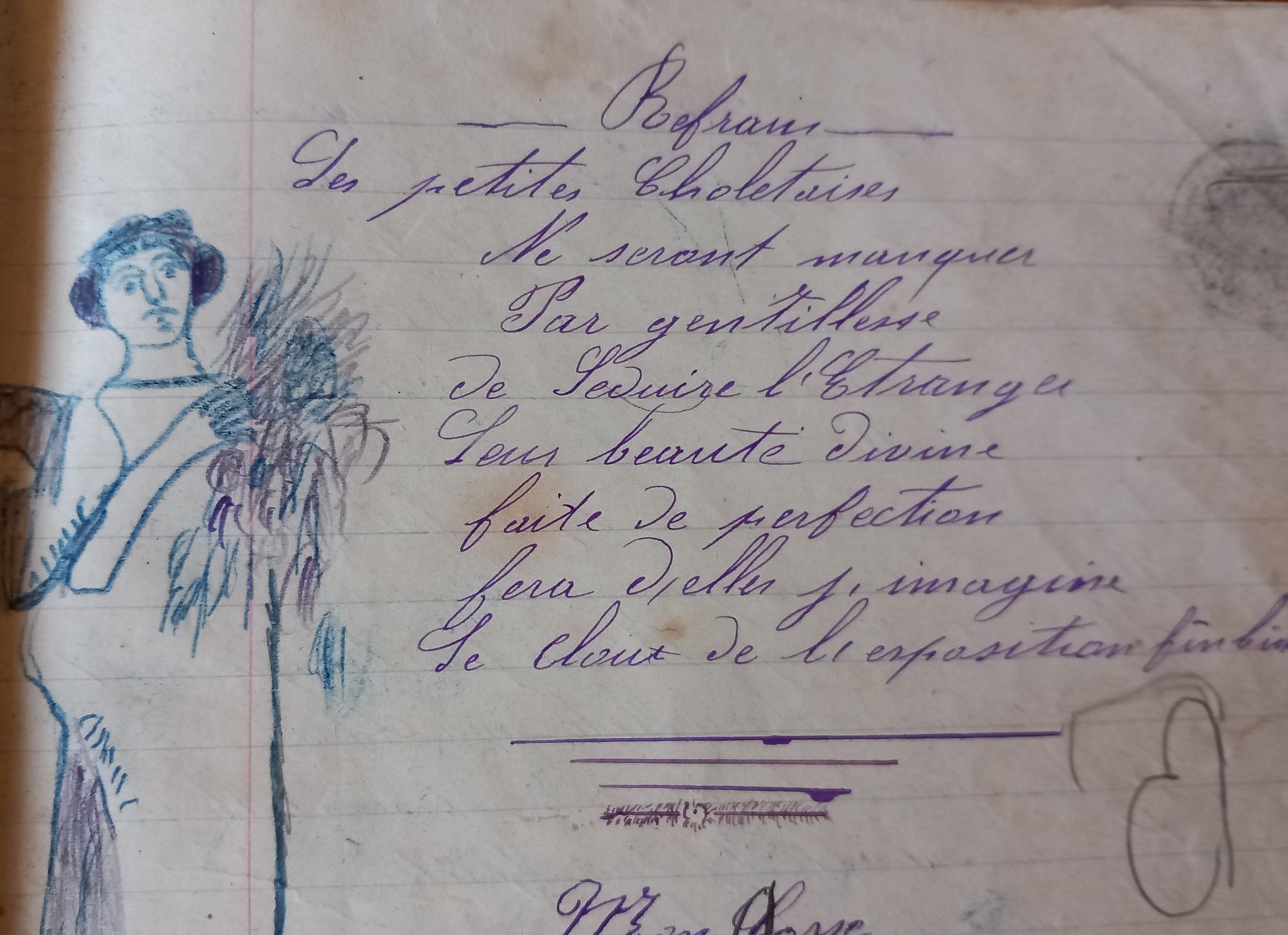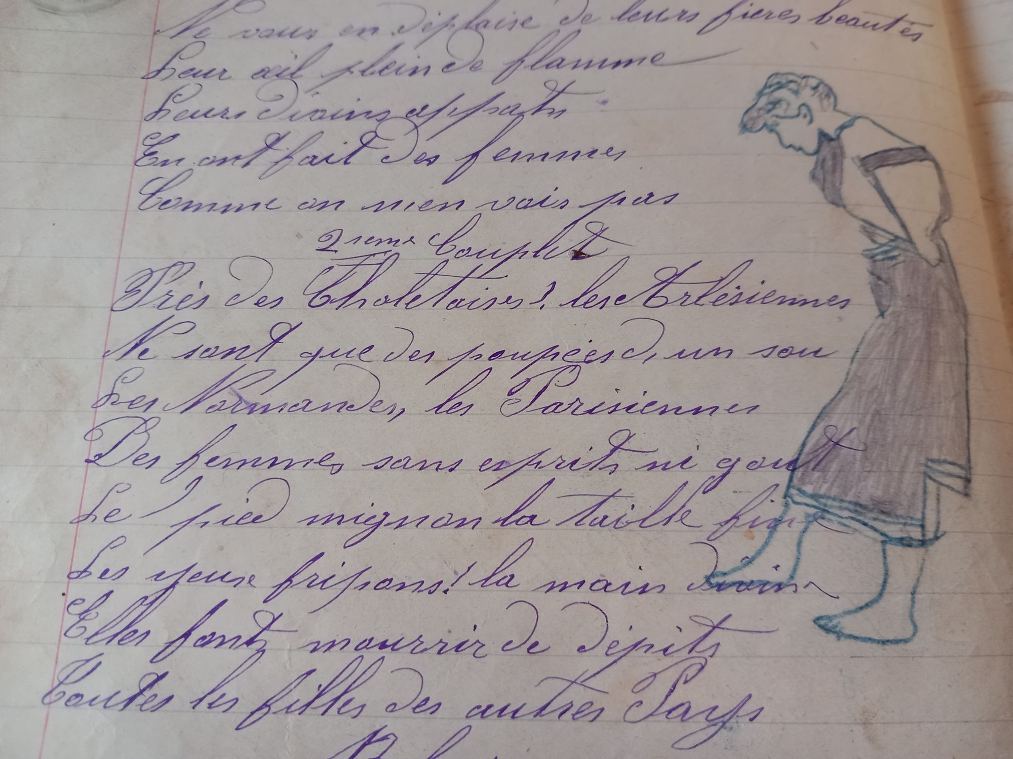 Les Archives ont reçu en don un petit cahier ayant appartenu à un soldat de la classe 1907, caserné à Cholet. À l'intérieur de ce cahier, tenu pendant la conscription de son propriétaire, sont recopiées les paroles de nombreuses chansons, des dessins et des lettres : 49 chansons d'auteurs connus mais aussi nées de la plume du soldat, une lettre "de parents à leur fils", un récit romancé, plutôt grivois, sur les liaisons de la femme du capitaine du 77e Régiment de la caserne Tharreau. Les femmes sont partout dans les textes et les dessins, visiblement autant que dans les pensées du jeune conscrit ! Son travail de copie est de longue haleine : les textes ne sont pas tous copiés à la même époque, parfois, plutôt que la date, c'est le décompte des jours restants avant la quille (fin du service militaire) qui apparaît.