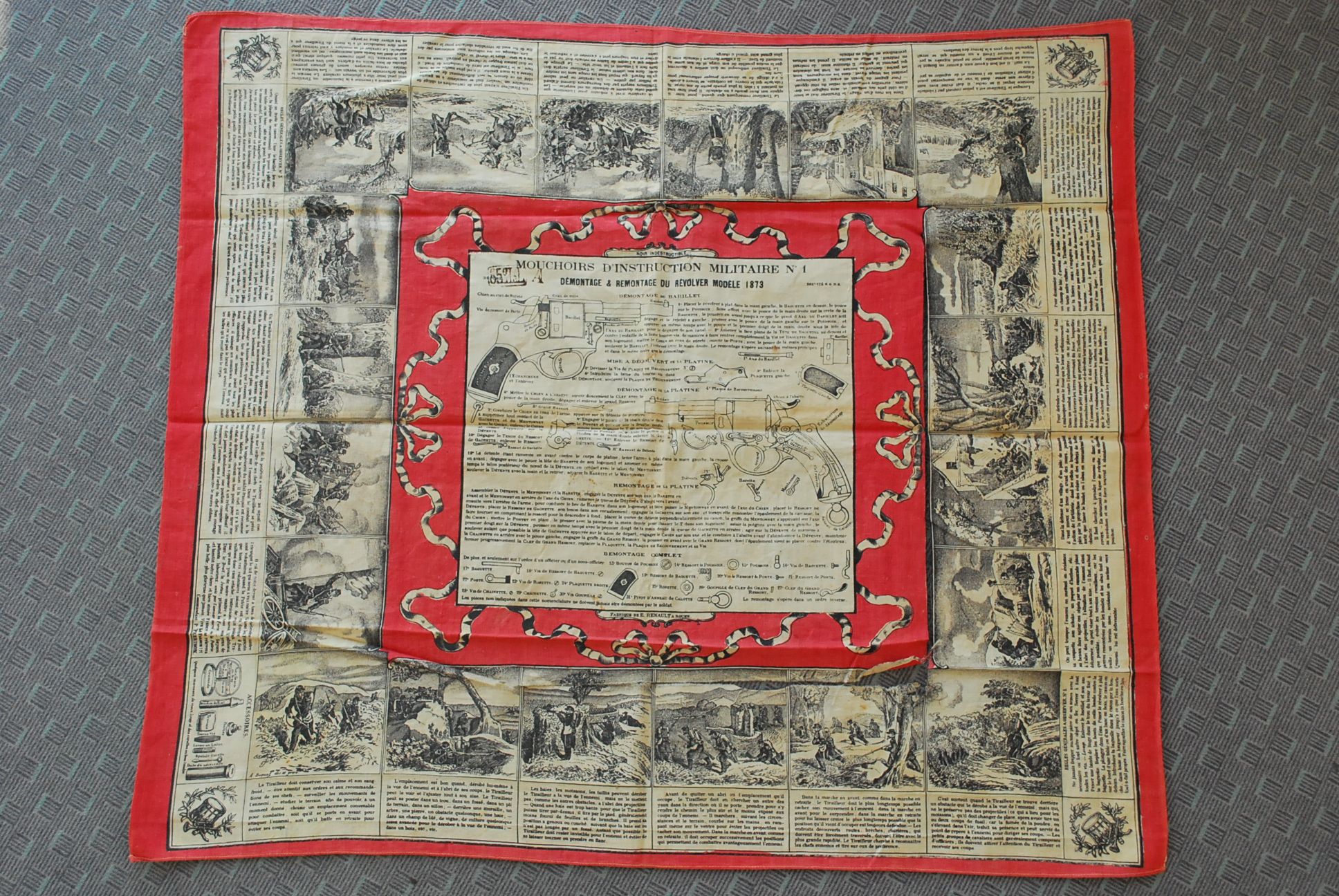 Chaque mouchoir détaille une technique militaire : démontage et remontage du fusil, composition du paquetage, harnachement du cheval…