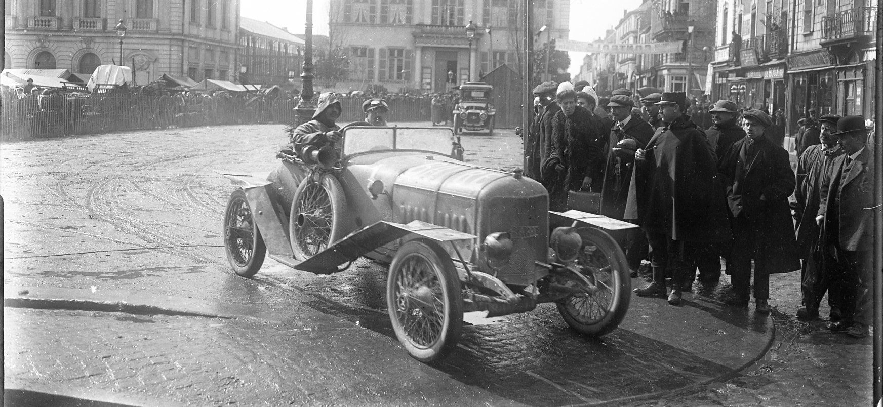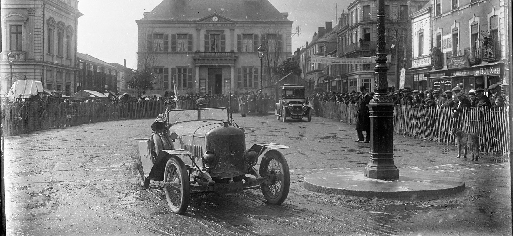 Ces photographies représentent le passage de voitures au point de contrôle, situé place Travot, lors d'une course automobile. Depuis le début du XXe siècle, le journal "L'Auto" organise un Tour de France automobile sur les routes de France. Le circuit, long d'environ 5000 km, a pour but de mettre à l'épreuve la solidité et l'endurance des voitures de tourisme pendant un mois. En mars 1914, lors de l'étape Limoges-Le Mans, la course passe à Cholet. Le point de contrôle, assuré par monsieur Frappier, est installé sur la place Travot. Ce jour-là, le temps est exécrable, on peut voir la boue au sol sur les photographies, cela n'empêche pas la foule de se presser le long du parcours pour apercevoir les voitures ! 32 équipes participent à l'épreuve.