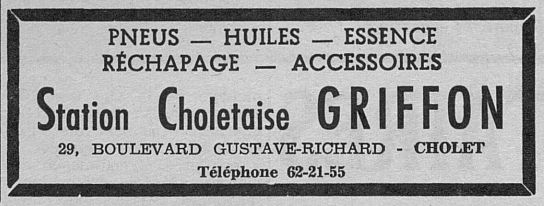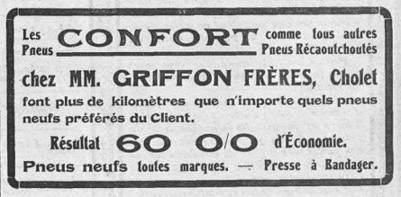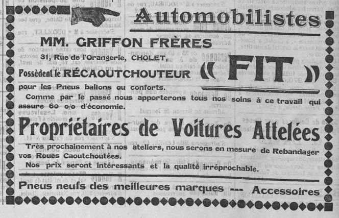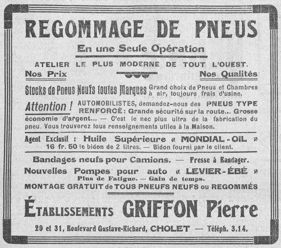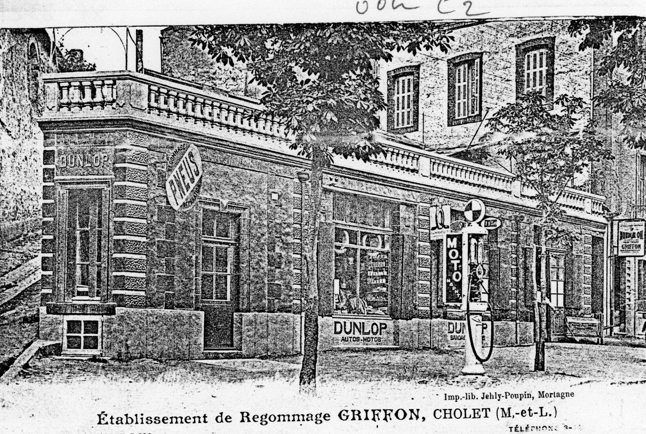 Pierre et Jean-Léon Griffon, deux frères, originaires de Saint-André-de-la-Marche, s'associent et fondent, en 1922, rue de l'Orangerie, un magasin de vente de pneus de voitures et de bicyclettes ainsi qu'un atelier de regommage, réparation et réchappage de pneus. Ils étaient auparavant propriétaires d'un café situé sur la place Travot.