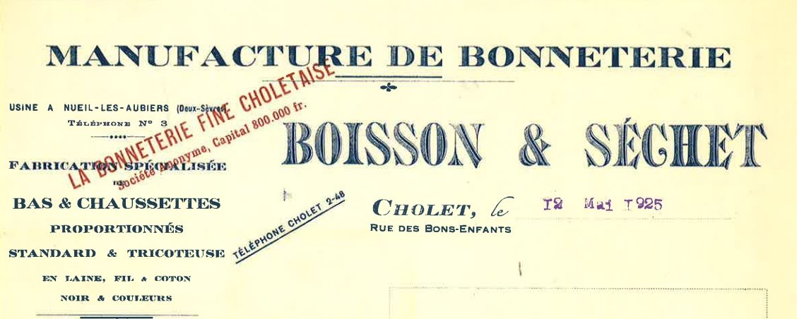 Léon Boisson (1898-1950), industriel, possède une usine de fabrication de bas et de chaussettes à Nueil-les-Aubiers dans les Deux-Sèvres en 1922, sous la raison Boisson et Séchet. Cette société est dissoute en 1925 et devient La Bonneterie Fine Choletaise dont le siège sociale se trouve, lui, à Cholet.