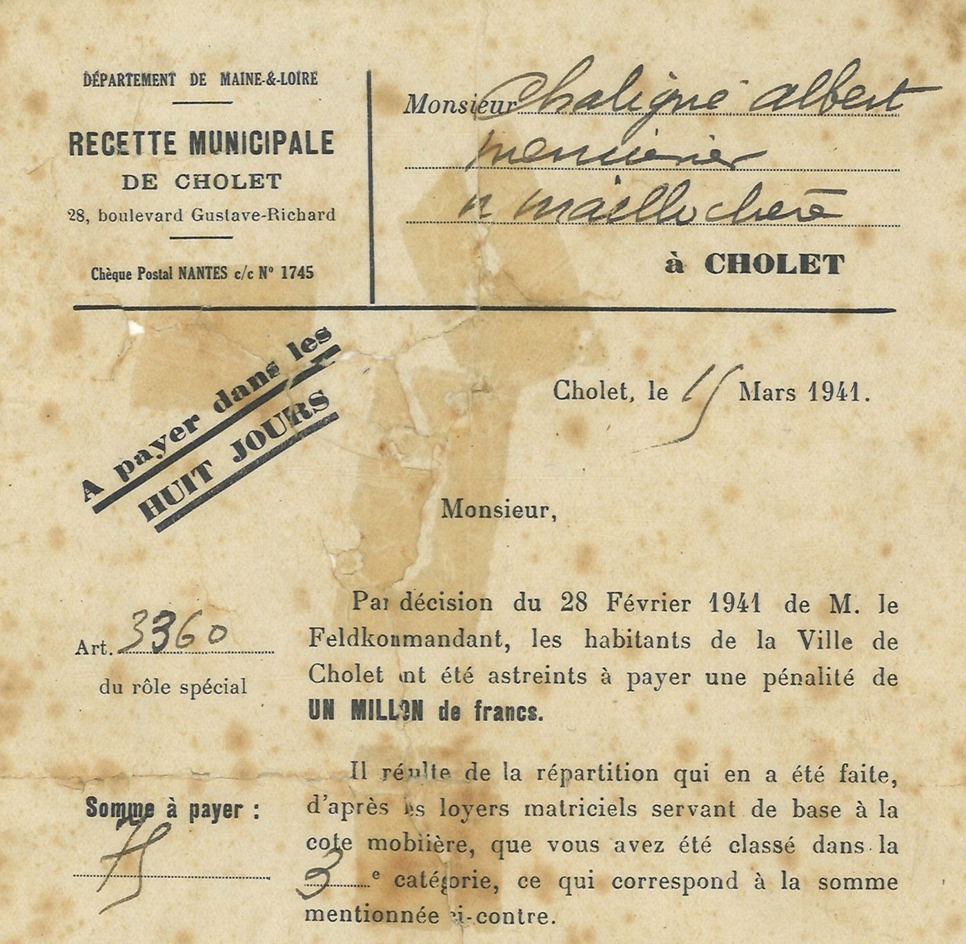 La Ville de Cholet et ses habitants sont condamnés à verser une énorme amende, de 1 000 000 de francs (ancien), à l'armée d'Occupation, suite à l'assassinat, en février 1941, du soldat allemand Karl Müller, sur la place de la République.
