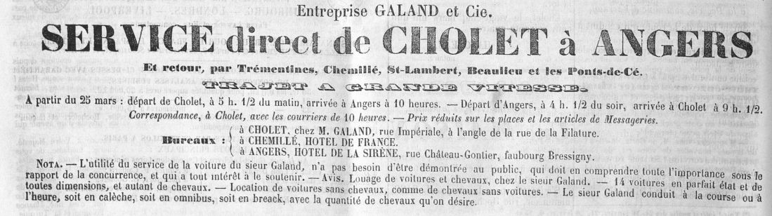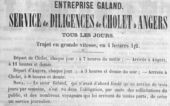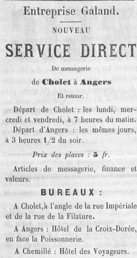 D'après la presse, dès 1863, Jean-Baptiste GALAND propose, trois jours par semaine, un service de messagerie pour les colis, mais aussi pour les voyageurs vers Angers "Trajet en grande vitesse, en 4 heures 1/2" puis "le sieur Galand [...] s'est vu dans l'obligation, par suite des sollicitations du public, et des nombreux voyageurs qui lui arrivent de toutes parts, de créer un service journalier.". Les années suivantes, de nouvelles destinations seront desservies : Nantes, Clisson, Saint-Laurent, La Châtaigneraie... Il propose également de transporter les habitants vers les lieux des manifestations lors des jours de fêtes.