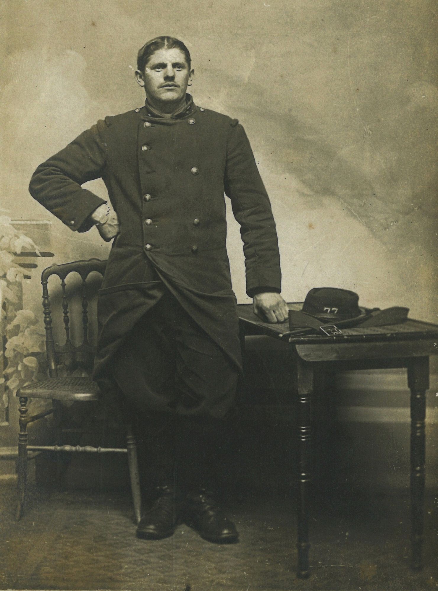 Quelques photographies de la famille Baudin sont entrées, sous forme de don numérique, dans les collections des Archives municipales. Parmi elles, le portrait d'un Poilu en uniforme... Clément Baudin (1892-1964), originaire de Saint-Aubin de Baubigné, est domestique de ferme. Il fait ses classes en 1912 à la caserne Tharreau de Cholet puis est mobilisé en août 1914 et survit aux quatre années de guerre. Blessé à la jambe par un éclat d'obus, lors de la bataille de Mondement, en septembre 1914, il se promet de faire le trajet jusqu'à Lourdes s'il revient vivant dans ses foyers, ce qu'il fait à son retour, en août 1919. Après la guerre, il s'installe à Cholet et devient homme à tout faire, d'abord au tissage de La Maillochère, situé chemin de La Tuilerie, puis, à partir de 1941, dans le centre d'apprentissage qui le remplace. Le tissage et le centre d'apprentissage se situaient à l'emplacement actuel du Lycée Renaudeau. Le patron du tissage, Henry Lemaire, est originaire du Nord de la France. Il achète l'usine choletaise en 1920, dès son retour du front, car l'usine qu'il possédait dans le Nord a été détruite par les bombardements. Ainsi, le patron et l'homme à tout faire partagent la même expérience d'anciens Poilus de 14-18.