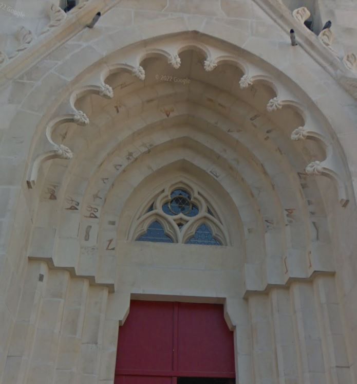 Sur l'archivolte de l'église Notre-Dame (bandeau formé de moulures ornementées qui encadrent les portes), on peut voir de nombreuses formes géométriques, des lettres et des symboles. Ces étranges signes ont été gravés dans la pierre par les tailleurs de pierre qui ont travaillé à la construction de l'église de la fin du 19e siècle. Il s'agit de marques de tâcherons. En effet, les tailleurs de pierre signaient chaque pierre taillée avant le transport. Chaque tailleur avait une marque particulière et les pierres ainsi estampillées permettaient au tâcheron d'être payé pour son travail.