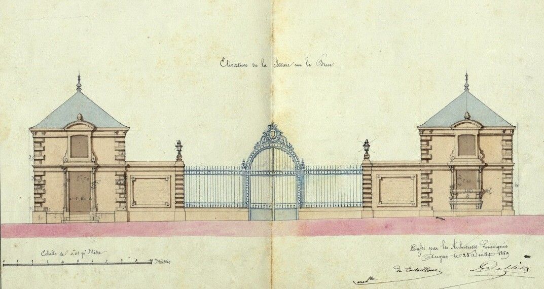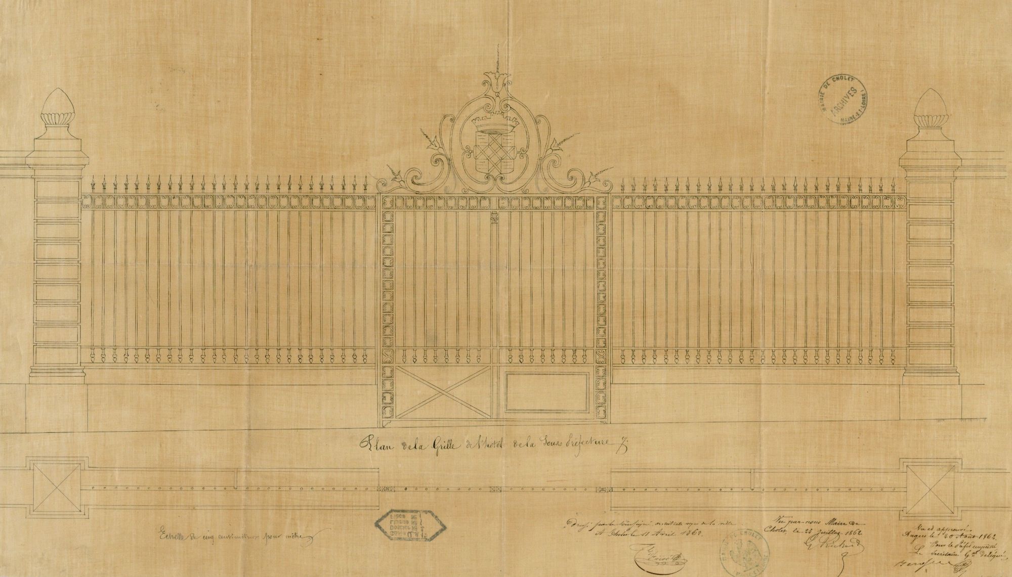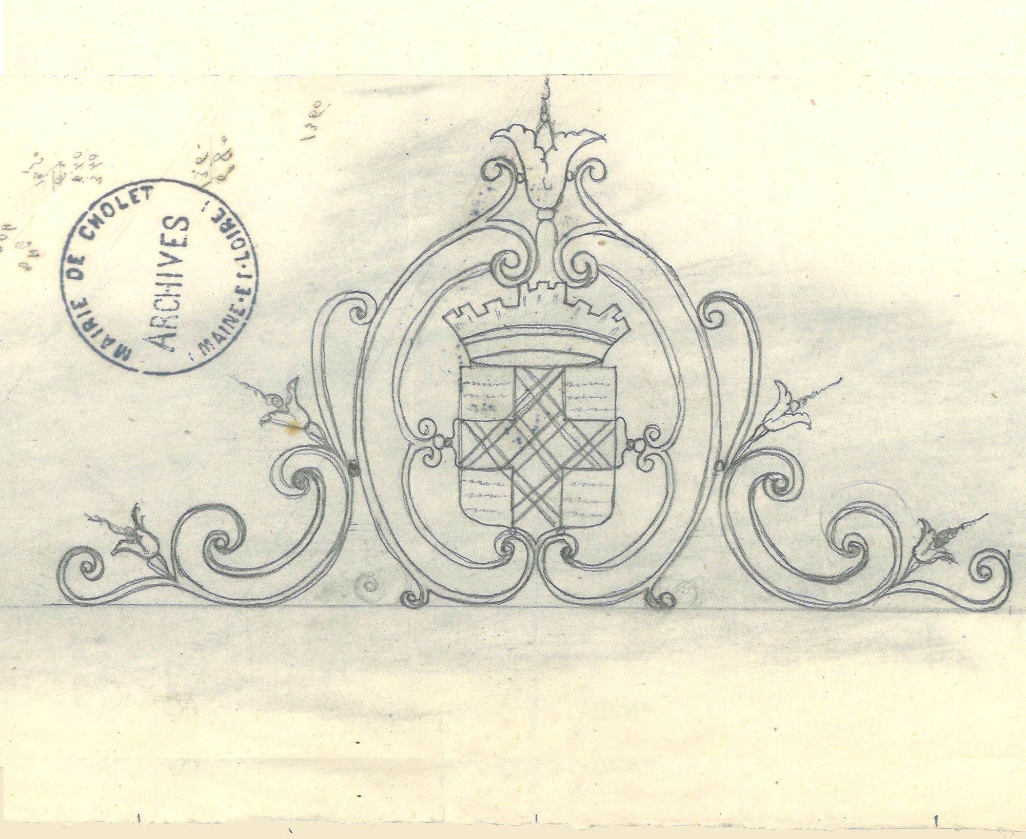 En 1861, le maire Gustave Richard, réflechit aussi à la construction d'une grille d'entrée ornée des armes de la ville. Il confie cette tâche à monsieur De Coutailloux qui fait des recherches sur le blason de la Ville : "je me suis procuré très fidélement les armes de la ville de Cholet pour vous bien fixer sur les frais à faire pour cet objet. Je me suis adressé à un bon sculpteur de votre ville que nous pourrions charger de l'éxécution. Il demande 50 francs pour un modèle en plâtre et 30 francs pour deux écussons en fonte de fer accolés l'un à l'autre pour former double face, surmontés d'une couronne".