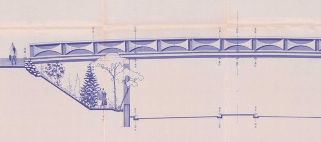 En 1976, une passerelle piétons est construite au dessus de la rue de l’Abreuvoir afin de relier le jardin public et le tout nouveau centre commercial Mail 2. Elle est l’œuvre de l’architecte Marc Delanoy. L’ouvrage en béton, construit par l’Entreprise Générale de Travaux Publics Jean Le Guillou, mesure 34 mètres de longueur et presque 4 mètres de largeur. Le garde corps est en béton architectonique blanc (ensemble de plusieurs types de bétons décoratifs) et cadres aluminium, dans le style décoratif des immeubles de Mail 2.