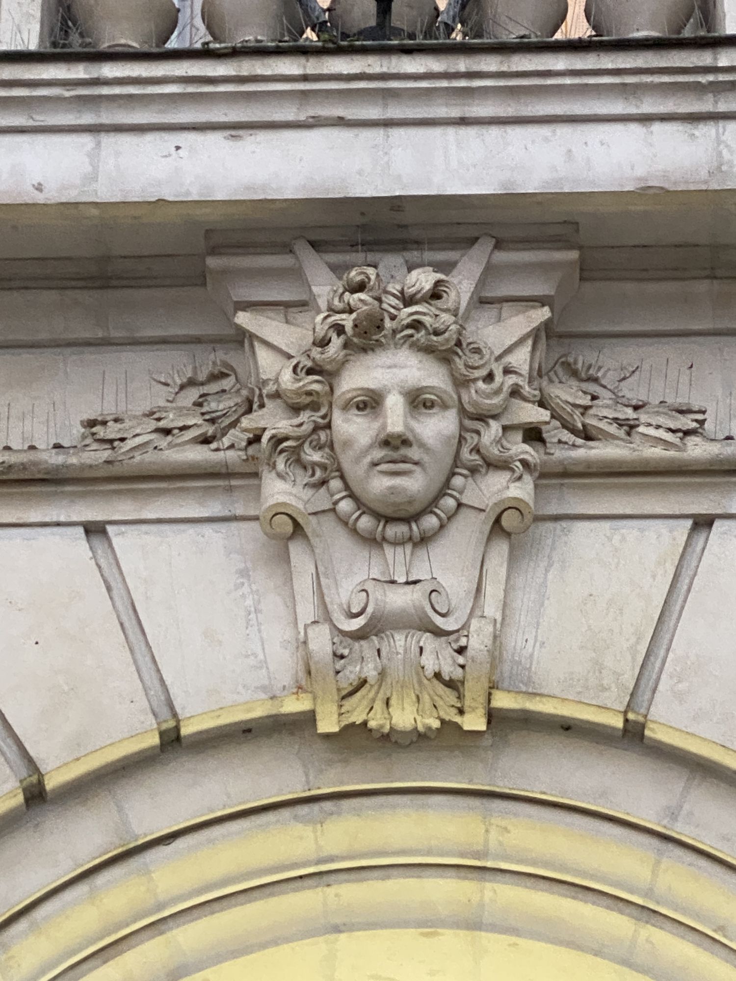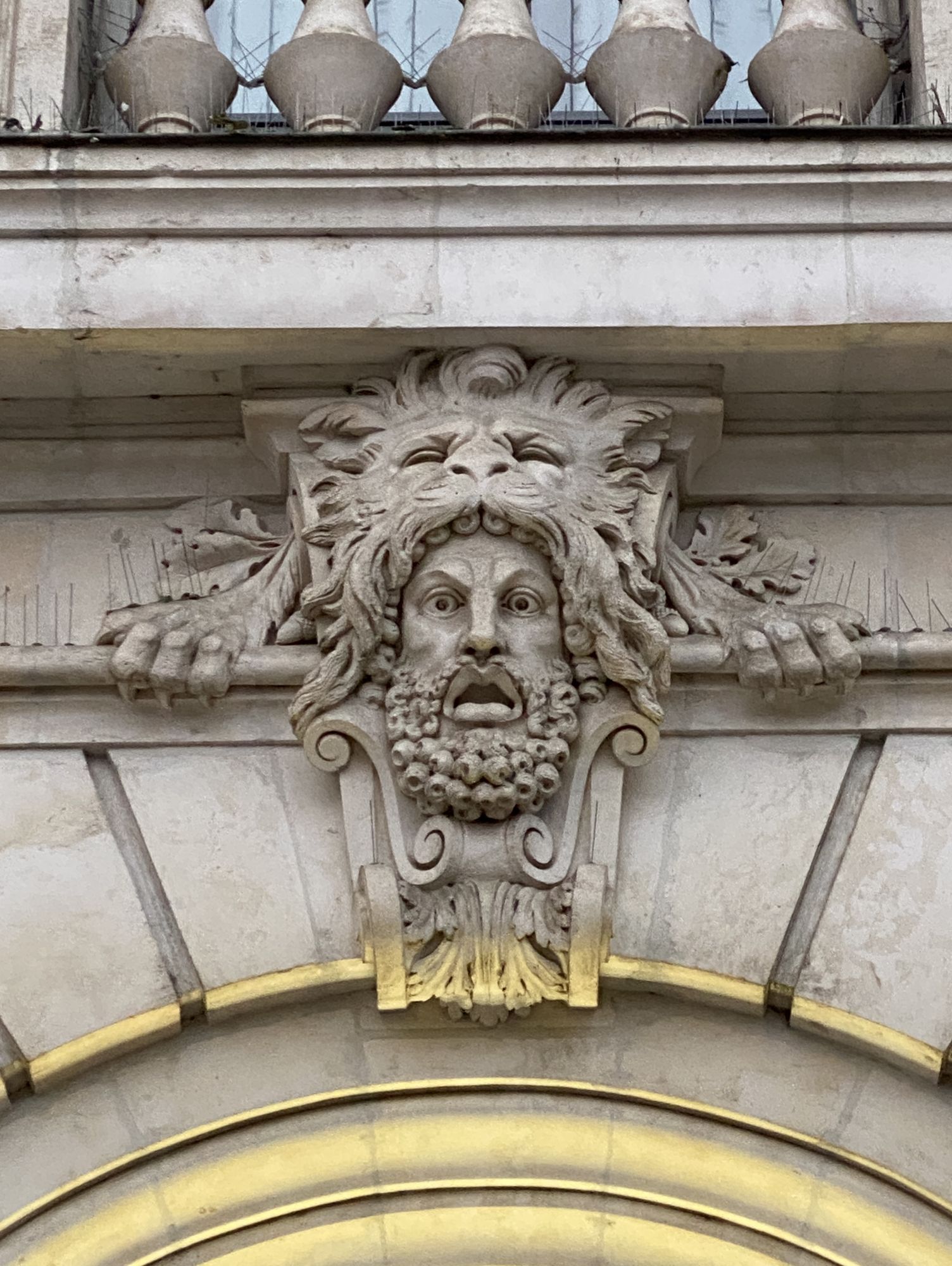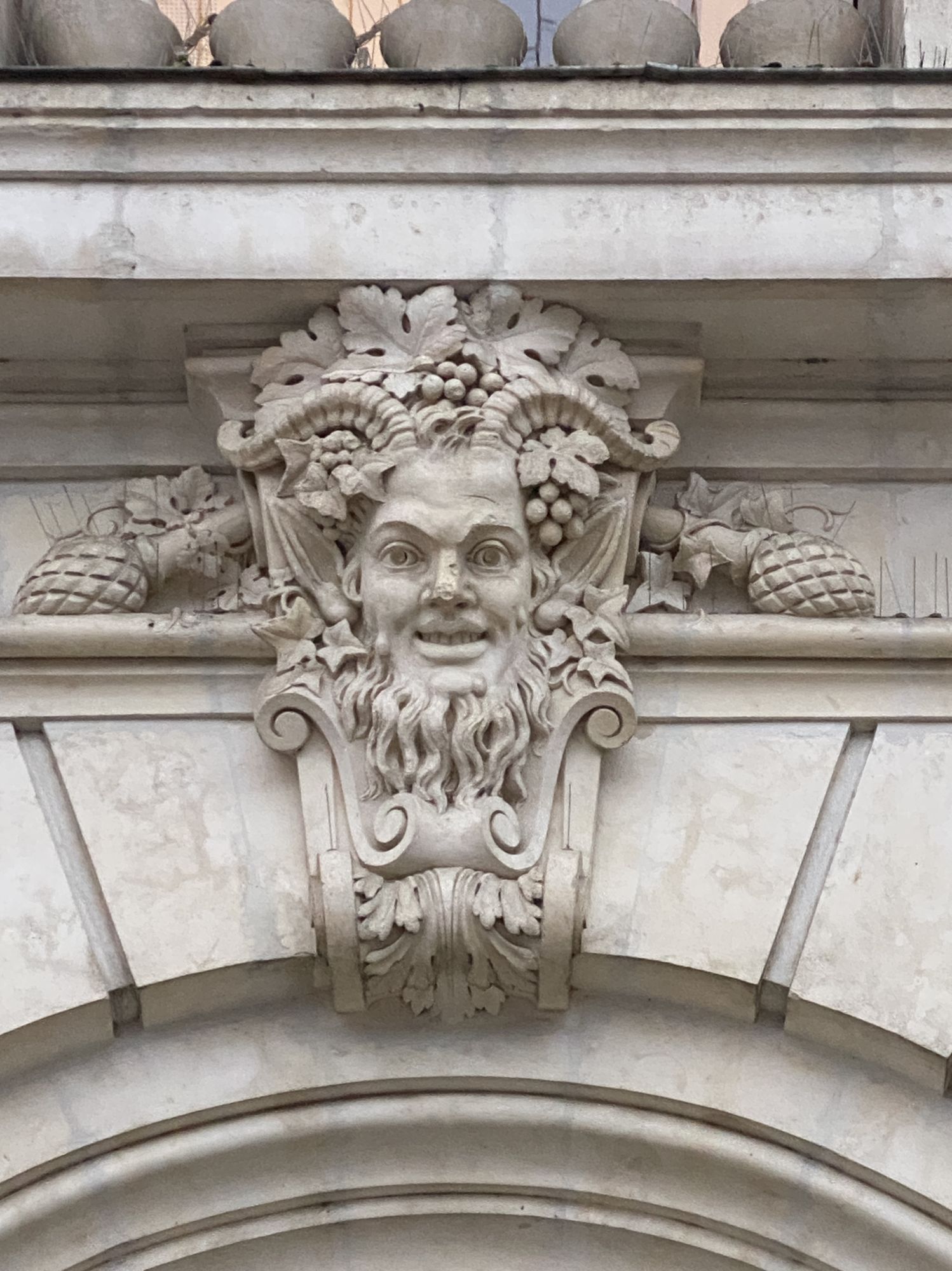 Pour l'apparence : visage souriant, oreilles pointues, cornes de bouc et barbe ; pour le décor : raisin et pommes de pin. Si les raisins peuvent immédiatement faire penser à Bacchus, la divinité sculptée ici est Pan, associée dans l'expression théâtrale au registre du comique avec sa flûte et souvent représentée avec les attributs du bouc.