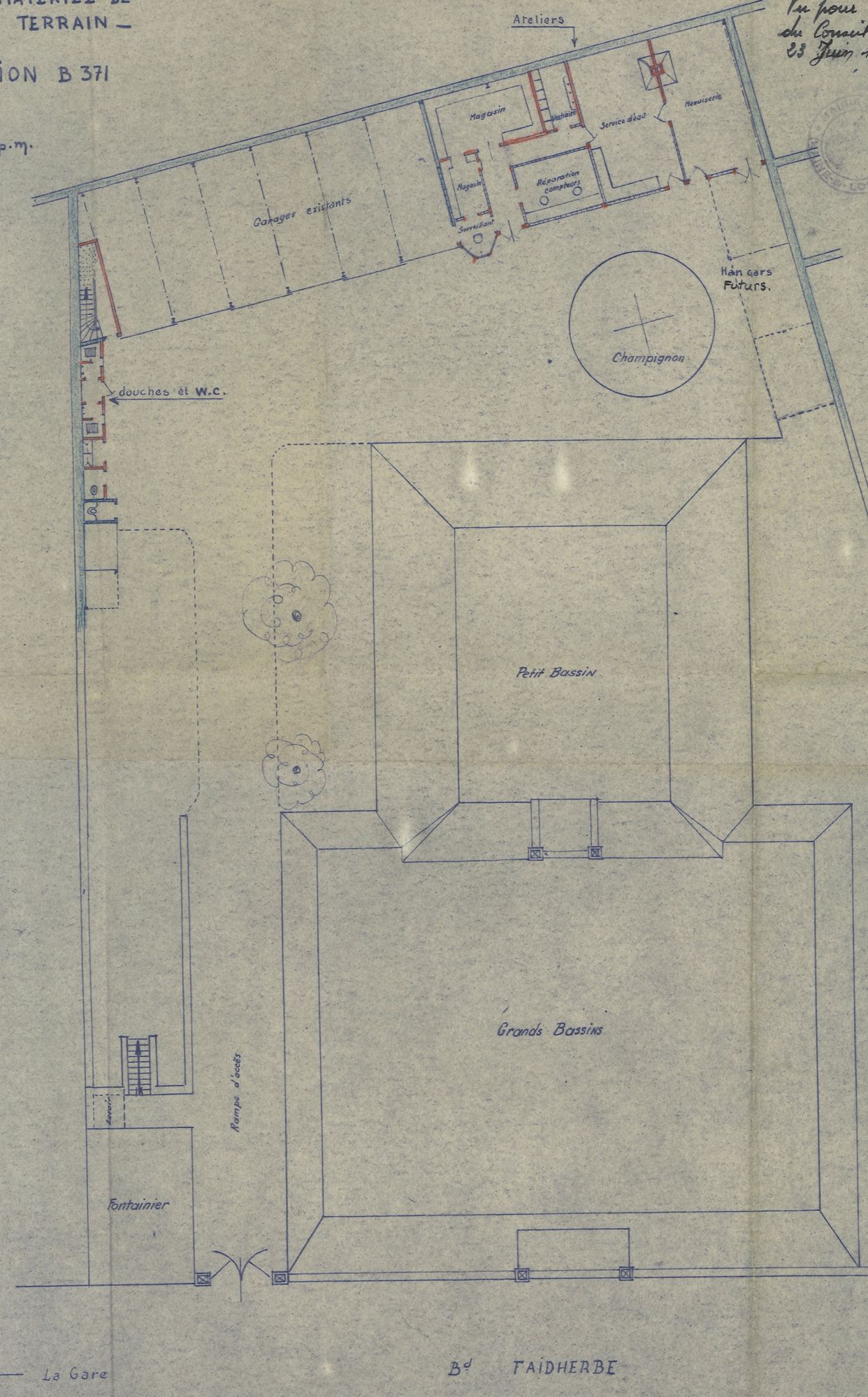 Le saviez-vous ? À l'emplacement de l'actuelle station de lavage et du laboratoire, boulevard Faidherbe, se dressait, jusqu'en 1981, un château d'eau ! Il est construit en 1930 face à la "nécessité absolue d'alimenter en eau potable le quartier haut de la Ville". Il existait auparavant, à cet emplacement, un petit réservoir d'eau construit à la fin du XIXe siècle, une forge et, à partir de 1928, des ateliers municipaux. Le château d'eau est construit en 1930 selon les principes des brevets Monnoyer. Il s'agit d'un réservoir sur tour en béton armé en forme de champignon. Une forme jugée plus esthétique qu'un réservoir sur chevalement, argument "sérieux, pour une construction à faire en pleine ville". Le réservoir du château d'eau est obligatoirement en hauteur pour fournir la pression nécessaire au robinet ! Deux bassins enterrés sont construits devant le château d'eau ainsi qu'une petite maison pour le fontainier. Pour monter l'eau dans le réservoir, deux éléctro-pompes sont aussi installées. Dans les années 80, le terrain est vendu à la Société Vendée matériaux à qui il est fait "obligation de démolir le château d'eau" lors de la vente.