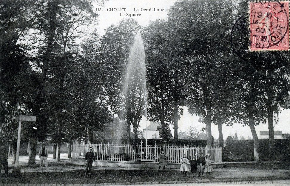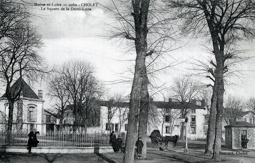 À l’origine, la Demi‑Lune est un croisement de chemins marqué par un calvaire installé vers 1830. Aucun aménagement n’existe alors ; il s’agit seulement d’un point de passage à l’entrée de la ville. En 1861, le lieu est déjà désigné comme une « place ». En 1877, les plans mentionnent une plantation régulière de marronniers qui en définit clairement le contour en forme de demi‑cercle. La fonction du site change à la fin du XIXᵉ siècle. En 1897, un pavillon d’octroi, une guérite et une bascule publique y sont installés. La Demi‑Lune devient alors un point de contrôle pour les marchandises entrant dans la ville. Parallèlement, la municipalité entreprend l’aménagement du lieu : un petit jardin circulaire de dix mètres de diamètre est créé, entouré d’une grille de fer, équipé d’un bassin en ciment avec jet d’eau et de cinq bancs disposés sous les marronniers. Ce jardinet occupe une zone qui servait auparavant de dépôt pour les Ponts et Chaussées. En 1905, un massif de fleurs complète l’ensemble. La place devient un espace de repos et de passage apprécié en entrant dans la ville. En 1972, la Demi‑Lune adopte la forme de rond‑point que l’on connaît aujourd’hui. Les espaces verts sont conservés, mais le bassin et les éléments décoratifs disparaissent.
