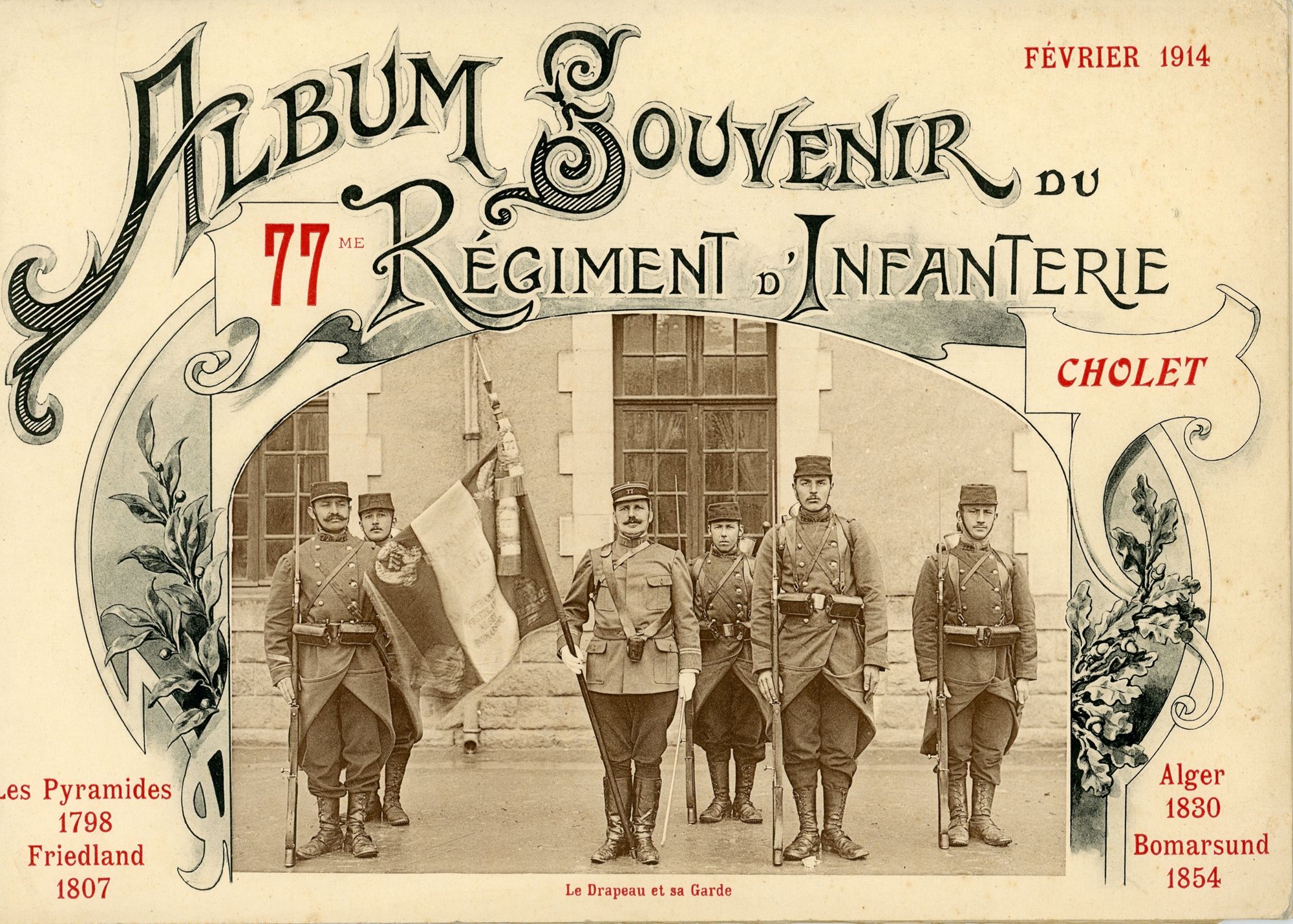 Un porte-drapeau a pour fonction de porter et d'exhiber le drapeau lors des batailles, des défilés ou des commémorations. Le grade militaire français du porte-drapeau est créé en 1762 par ordonnance royale. À partir de 1882, Cholet devient ville de garnison, après la construction de la caserne Tharreau. Son régiment, le 77e Régiment d'Infanterie, est l'héritier du régiment La Marck, de la 2e demi-brigade d'Infanterie légère et du 2e Léger. À partir de 1855, sa nouvelle dénomination, 77e Régiment d'Infanterie , et les noms de glorieuses batailles, comme Les Pyramides (1798) et Friedland (1807), sont inscrits sur son drapeau. Le drapeau tricolore, lui, apparaît à la Révolution et est officiellement reconnu en 1794 par décret de la Convention. Les couleurs de la capitale, le bleu et le rouge, sont alors associées au blanc, couleur de la royauté.