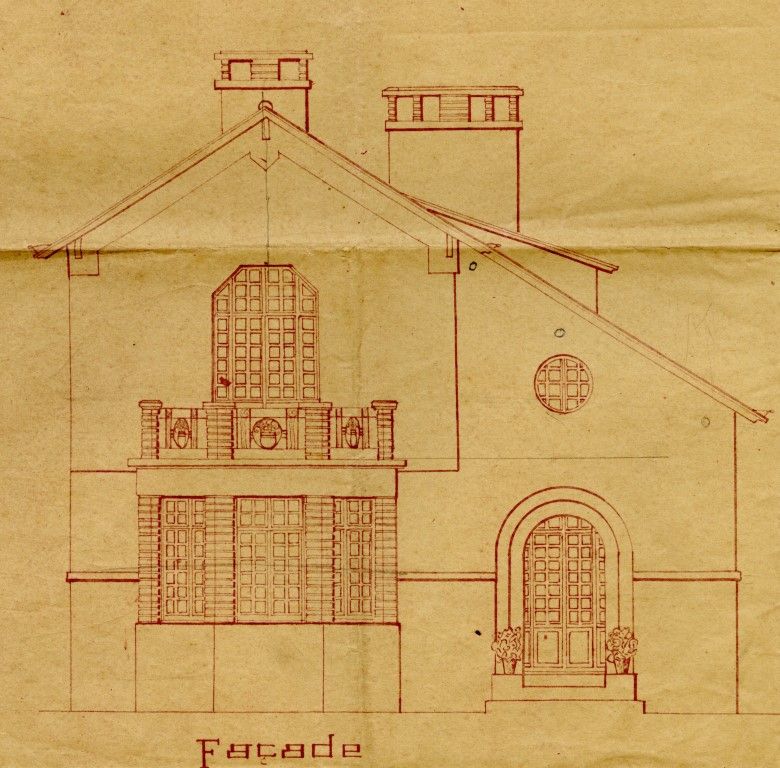 Le style géométrique de cette maison de l'entre-deux-guerres est d'inspiration "art déco" (pan coupé de la fenêtre haute, arcade de la porte d'entrée, fenêtre hublot, pilier et claustra de la clôture, bow-window). Sa maison est un exemple typique "d'architecture balnéaire" (nom italien sur la façade, composition de façade...). Elle dispose d'espaces extérieurs de transition qui permettent de fusionner intérieur et extérieur : jardin qui peut servir de salon d'été (séjour à ciel ouvert), balcon pour permettre l'observation du paysage, grandes baies du salon... La composition de la façade principale fusionne deux styles régionalistes : le style anglo-normand qui se caractérise dans ce projet par une association verticale bow-window / balcon / forme de toit en pignon avec avancée de toiture et le style basco-landais caractérisé par une façade principale abritée sous deux pans de toitures asymétriques.
