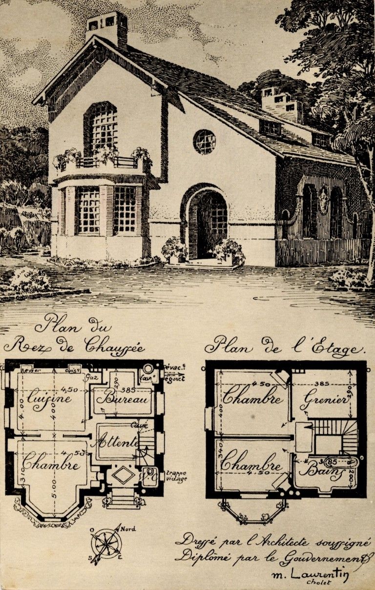 Vous pouvez consulter, en salle de lecture des Archives, le dossier 3J265 : EMERIAU.- Cholet, rue de la Croix Blanche, maison d'habitation, véranda et clôture : plans clôture, détail porte, plan élévation, coupe, maison, relevé mitoyenneté, devis, états, photo, carte publicitaire, 1936-1937.