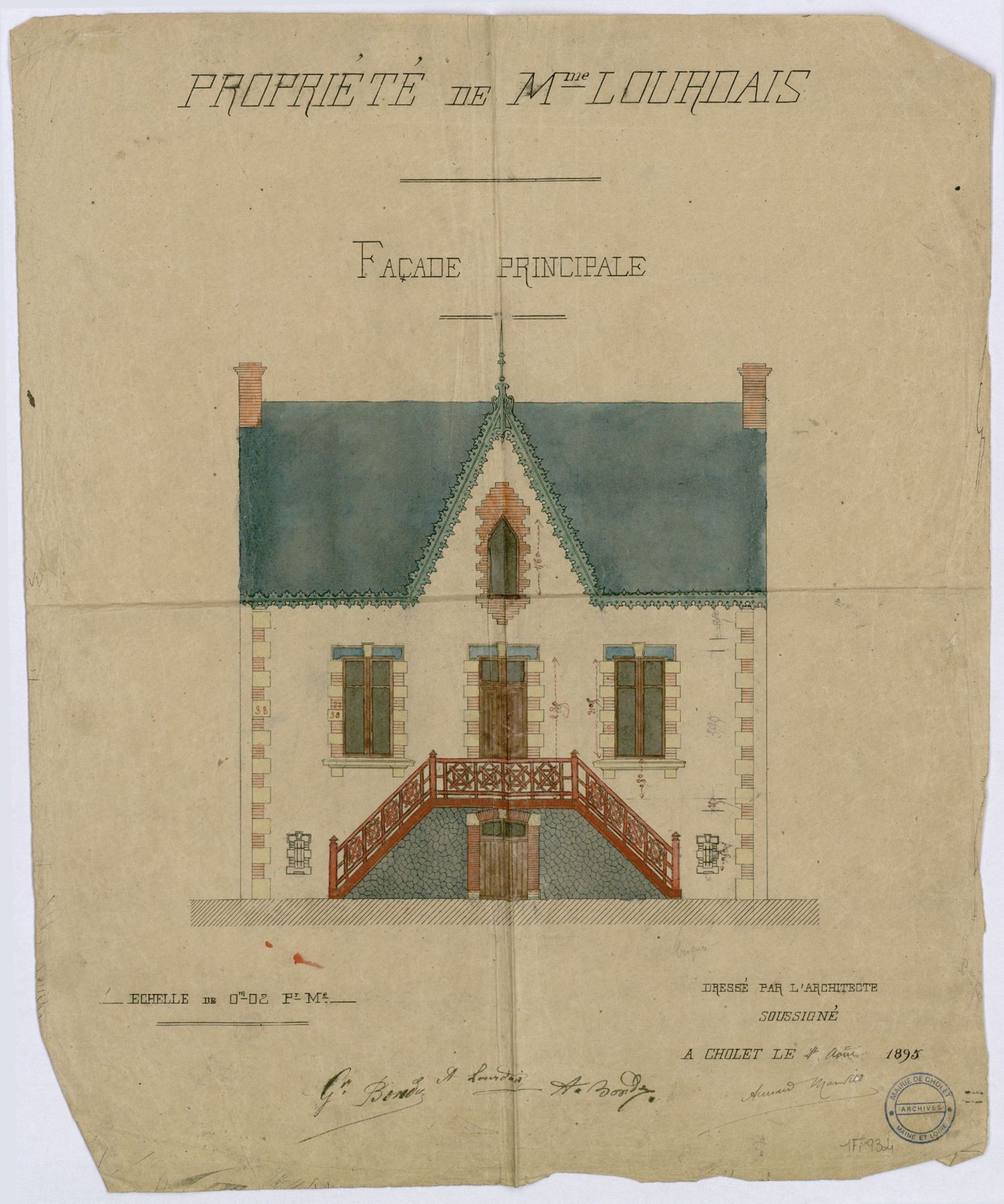 Pour en savoir plus, vous pouvez consulter le dossier 3J2113 : LOURDAIS.- Cholet. Impasse Gambetta, construction d'une maison : plan d'ensemble, plans, élévations, coupes, devis, cahier des charges, état des lieux. Architecte Manville. 1895-1896.
