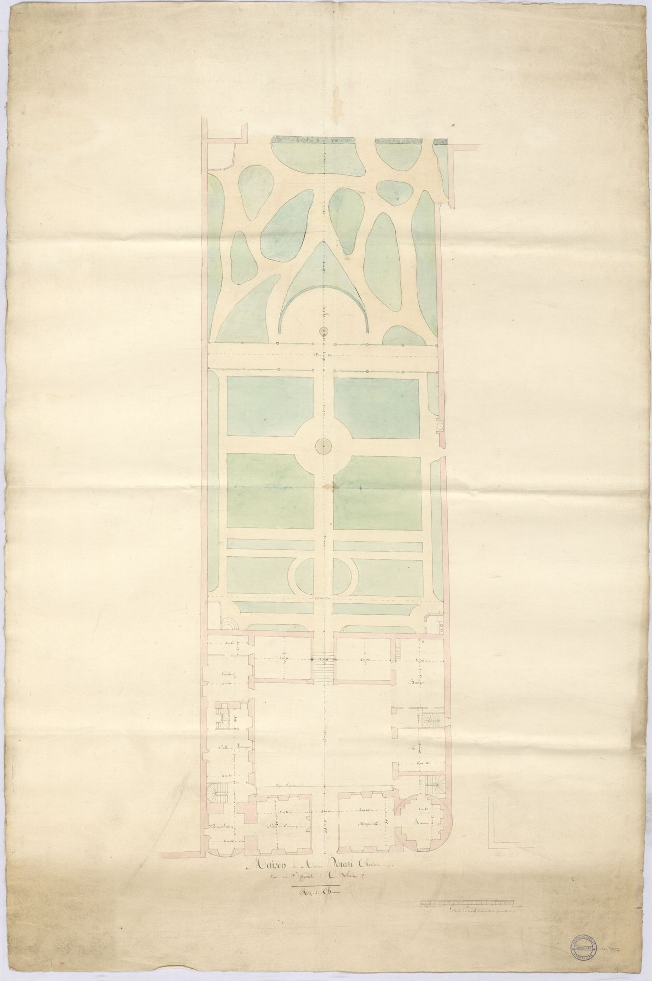 Rez-de-chaussée : décharge de cuisine ; cuisine ; salle à manger ; vestibule d'entrée ; salon de travail ; office ; salon de compagnie ; porche avec portail ; lingerie