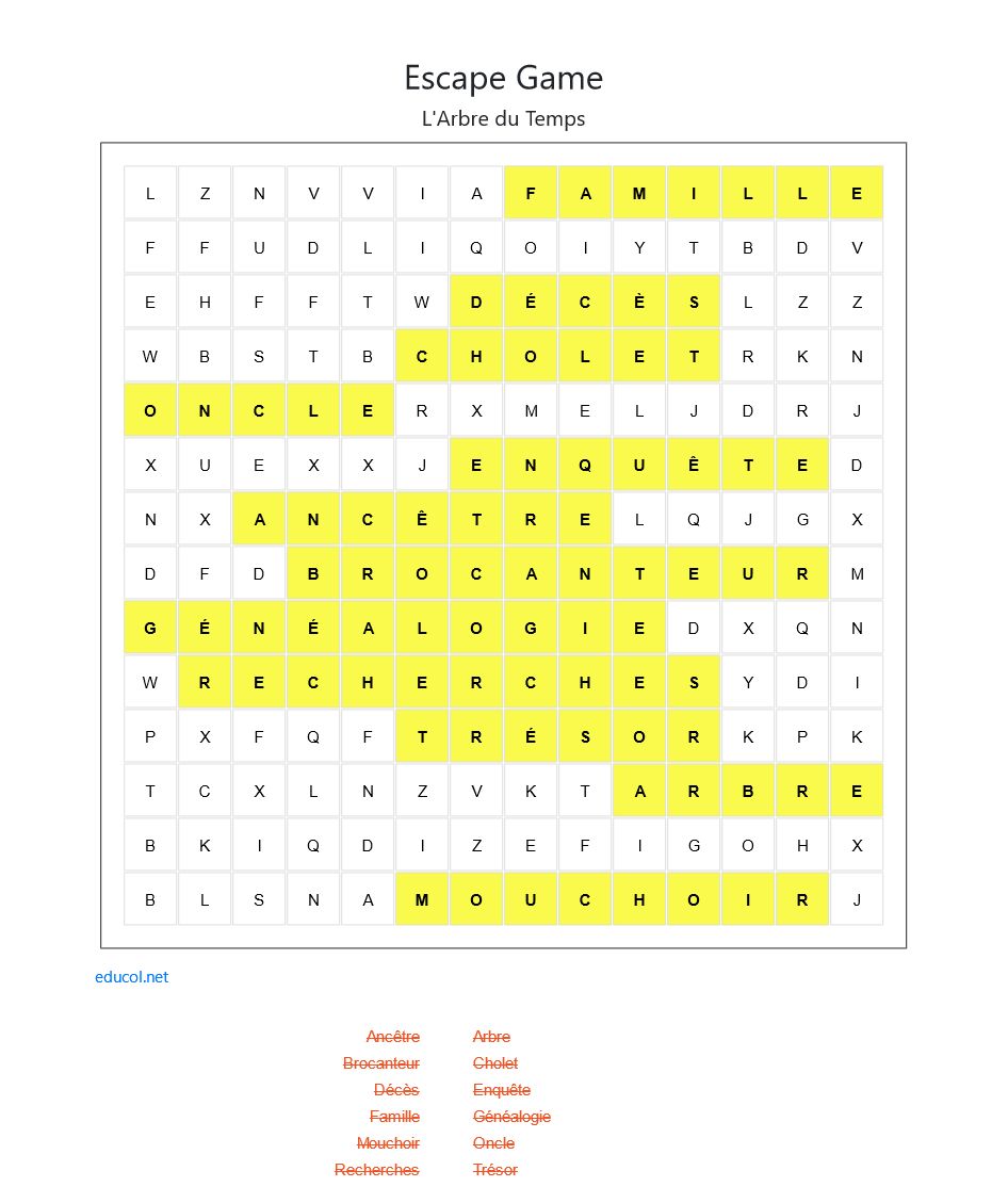 🖊 Mots cachés 1 4 Archives 2 4 Fonds d'archives 3 4 Salle de lecture 4 4 Service éducatif 1 4 Le Mystère du Poilu choletais 2 4 Le Secret des Halles 3 4 Le jeu de cartes 4 4 Les Armoiries Perdues L'Arbre du Temps