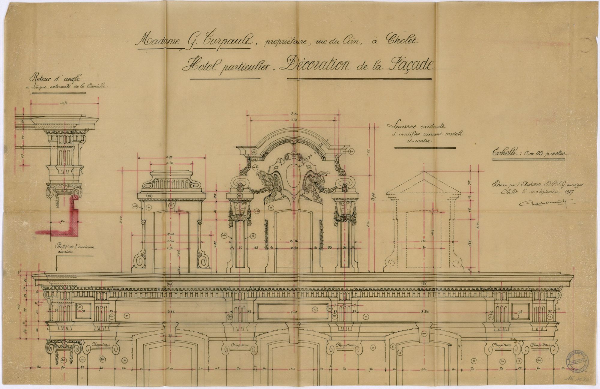 Nous vous invitons à consulter, en salle de lecture des Archives, le dossier de l'architecte conservé sous la référence 8J100 - TURPAULT, rue du Coin, travaux intérieurs (agrandissement de cuisine, création d'une salle à manger, transformation de la bibliothèque) : plans, élévations, coupes, lettres, métrés, bons d'acomptes, 1927-1929. Architecte Arnault.