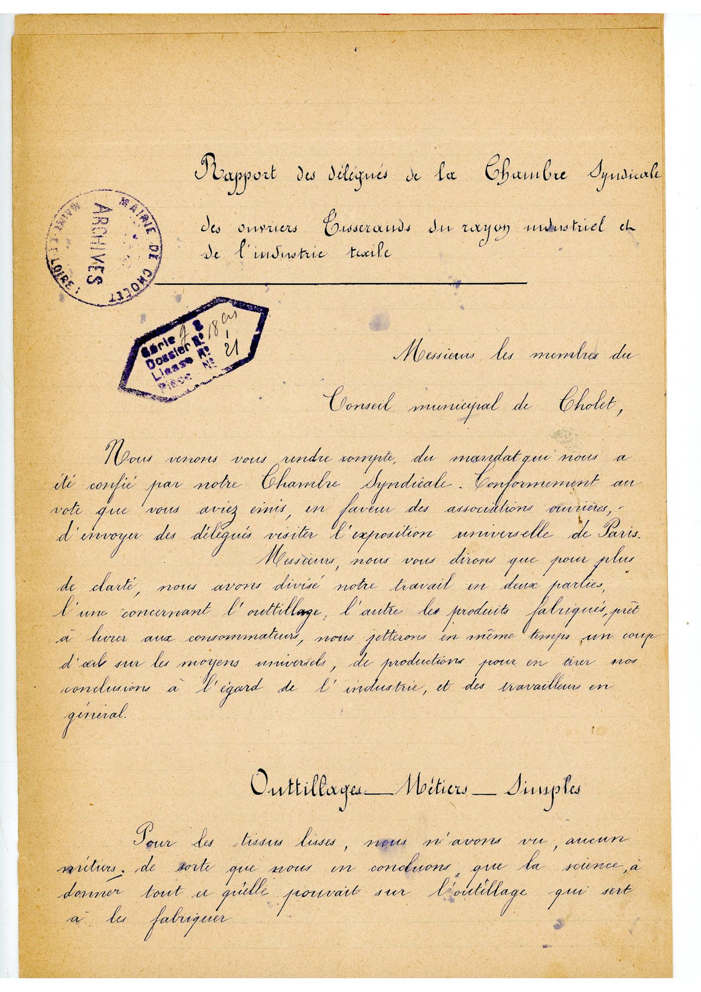 En 1889, le Conseil municipal de Cholet envoie plusieurs ouvriers et artisans visiter l'Exposition Universelle de Paris afin qu'ils découvrent les produits et les nouvelles techniques concernant leurs métiers. A leur retour, ils doivent rédiger un rapport sur ce qu'ils ont vu et ce qu'ils en ont pensé. La lecture de ces documents, rédigés par de simples travailleurs, permet de comprendre leurs perceptions des bouleversements industriels de l'époque.