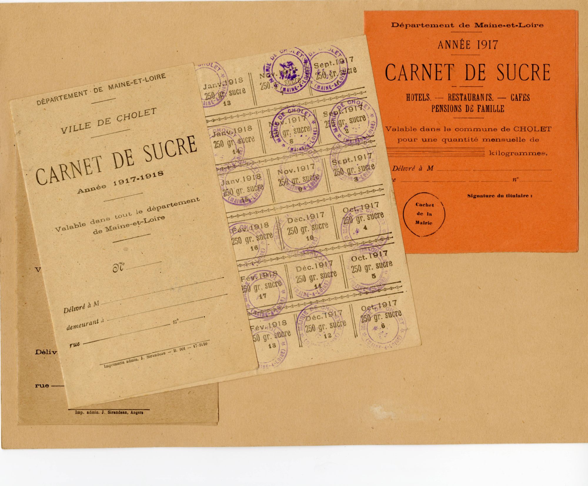 Pendant la 1ère guerre mondiale, la mobilisation des hommes, les réquisitions, l'occupation par l’ennemi de régions de production entraînent des difficultés de ravitaillement. Certains produits de première nécessité viennent à manquer et les prix augmentent. Une législation est mise en place pour organiser le rationnement du pain, du sucre, de la viande, du tabac, du charbon… et réglementer les tarifs. En 1917, le Maire de Cholet fixe le prix du sucre cristallisé à 1 franc 50 le kilo et à 2 francs 15 l'année suivante tandis que le sucre raffiné atteint les trois francs. Le carnet de sucre entre en vigueur à la fin de l'année 1917. La portion accordée est alors de 750 g par tête et par mois, puis cette portion diminue à 500 g. Malgré tout, le sucre manque souvent alors les tensions et les suspicions apparaissent. En février 1918, monsieur P, notable, doit publier un démenti dans deux journaux choletais, L'Intérêt Public et Le Réveil Choletais, pour répondre aux rumeurs qui l'accusent : " j'ai été amicalement prévenu, il y a quelques jours, qu'on répandait sur mon compte un bruit mensonger et calomnieux. D'après ce racontar, j'aurais demandé à mon fournisseur habituel un supplément important de sucre, en dehors de mes carnets de famille… Comme ce faux bruit a beaucoup circulé, et qu'on a cherché à l'exploiter contre moi, avec une intention très malveillante, dans une affiche manuscrite où l'auteur se donne des airs de Grand Justicier, tout en abritant sa mauvaise action sour le couvert de l'anonymat, je me décide à rendre public mon démenti. J'affirme donc que ce récit est entièrement faux et inventé… J'ajoute que je limite ma consommation de sucre à la quantité qui m'est attribuée... ". Façe à la pénurie de sucre, la population choletaise doit se contenter d'un succédané, la saccharine, enfermée dans des paquets de plus en plus petits, et ce jusque dans les années 20.