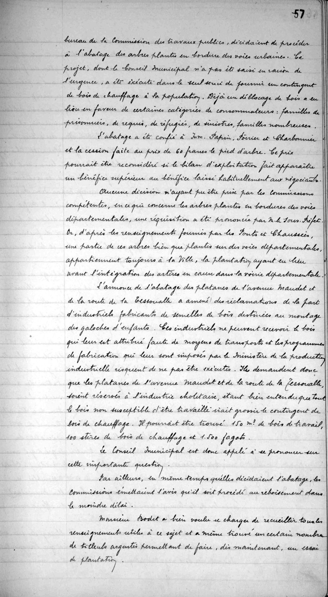 Janvier 1945, l'hiver est déjà bien installé et le choletais subit une crise du chauffage sans précédent. Entre les réquisitions militaires, le rationnement et les difficultés de transport, la population est presque totalement dépourvue de bois de chauffage. Des mesures sont prises pour approvisionner les foyers prioritaires en charbon : familles de prisonniers, de réfugiés, les familles nombreuses mais aussi les hôpitaux et les boulangeries, mais le stock ne suffit pas. C'est pourquoi l'administration se décide à sacrifier les arbres en bordure des voies urbaines. Sont concernés, entre autres, les boulevards Gustave Richard, Victor Hugo, Hérault, Chanzy, Delhumeau-Plessis, l'avenue Maudet et la place de la Demi-lune. C'est avec un serrement au coeur que la foule assiste à la mise à terre des marronniers du boulevard Gustave Richard, considéré alors comme l'une des plus belles avenues de la ville. Lorsque vient le tour des platanes de l'avenue Maudet, les industriels de la chaussure font, eux aussi, part de leurs revendications. Ils ont besoin du bois pour le montage des semelles de bois des galoches d'enfants et demandent que certains arbres leur soient réservés. Pour calmer les critiques, la municipalité s'engage à replanter immédiatement des platanes et des tilleuls argentés et confie cette tâche aux frères Bodet, pépiniéristes de Cholet.