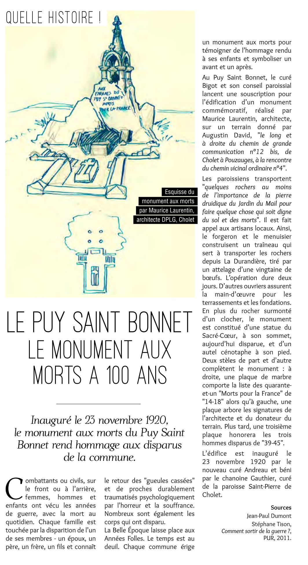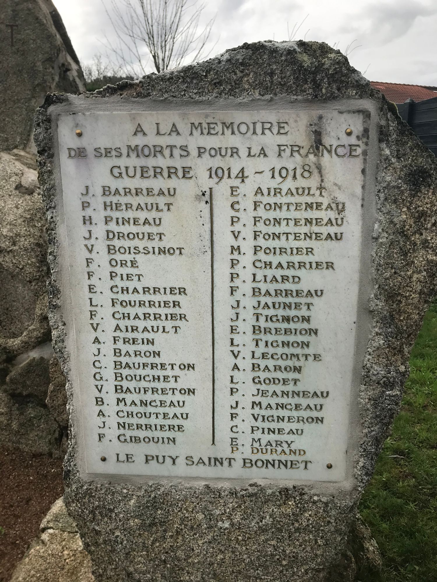 En 2020, il a été ajouté sur la plaque le nom de P. Durand oublié lors de l'élaboration de la plaque commémorative. Le soldat Pierre Marie Joseph DURAND est né aux Landes-Génusson mais habitait au moment de la mobilisation au Puy-Saint-Bonnet. Il est mort dans un hôpital du Pas-de-Calais le 19 mars 1915.