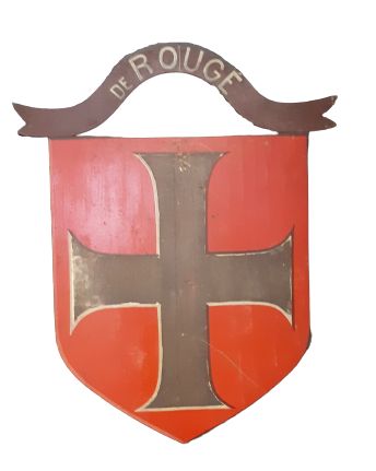 Blason. Armes de la famille de Rougé. " De gueules à la croix pattée et alaisée d'argent ". Peintre GENDRE. 1884.