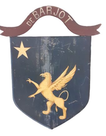 Blason. Armes de la famille Barjot. " D'azur au griffon d'or, à l'étoile de même en chef au canton dextre ". Peintre GENDRE. 1884.